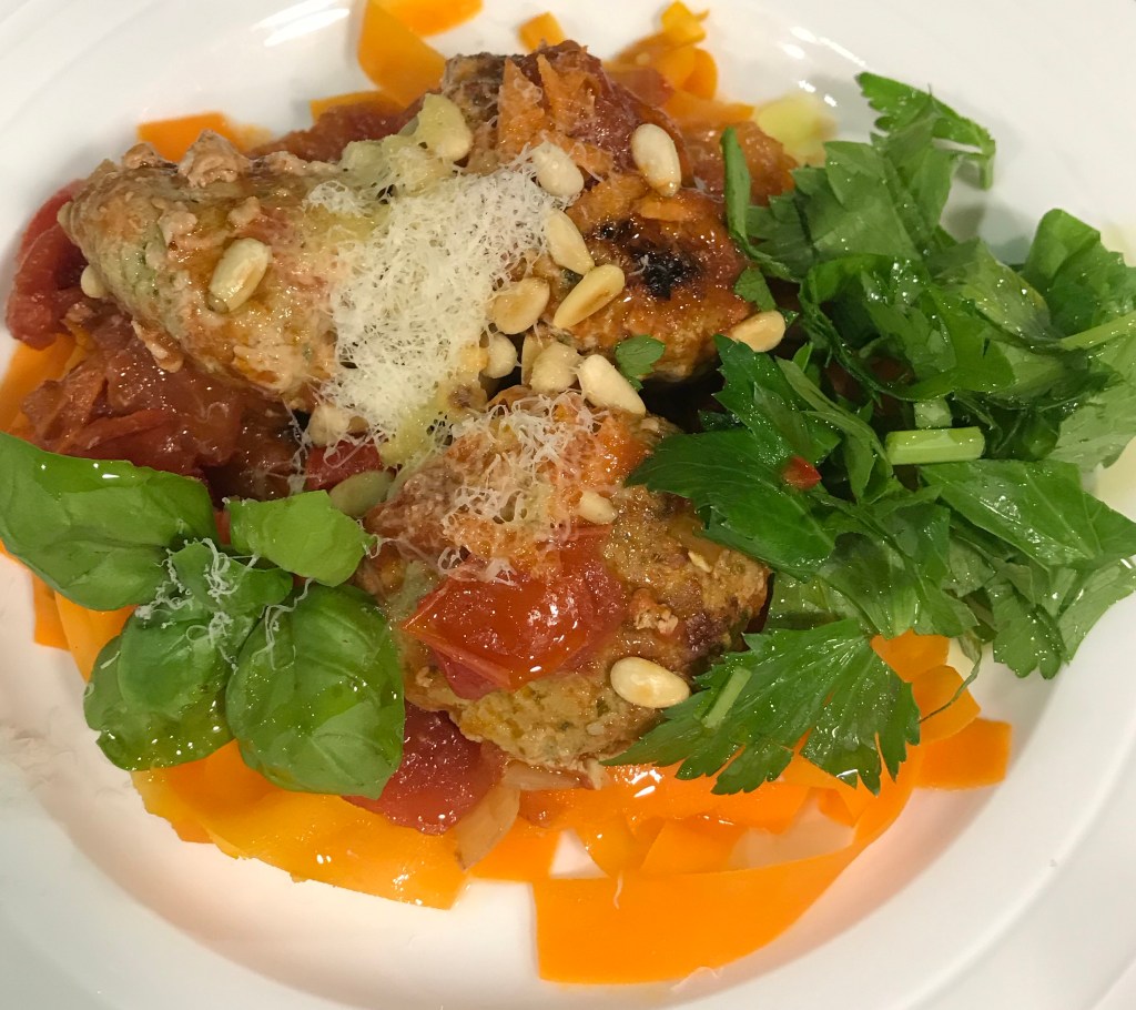 Mix and shape meatball ingredients. Pop in fridge for 30mins. Heat a pan to medium and brown the meatballs. Towards the end of the browning add the onion to cook to clear for a few minutes. Then add the two cans of tomatoes and the balsamic vinegar to the pan. Cook for around 15mins; add the extra veggies, cooking for a further 10mins until the tomato sauce is starting to reduce right down. If you have any chicken stock you can add a quarter cup of this as well to loosen the sauce a little.