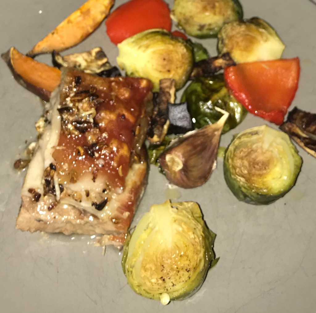 Brussells sprouts are perfect with this pork – roast them halved with garlic cloves, eggplant, capsicum and some orange kumara; underneath the cooking pork on the rack on the next level down – for around 30 minutes.