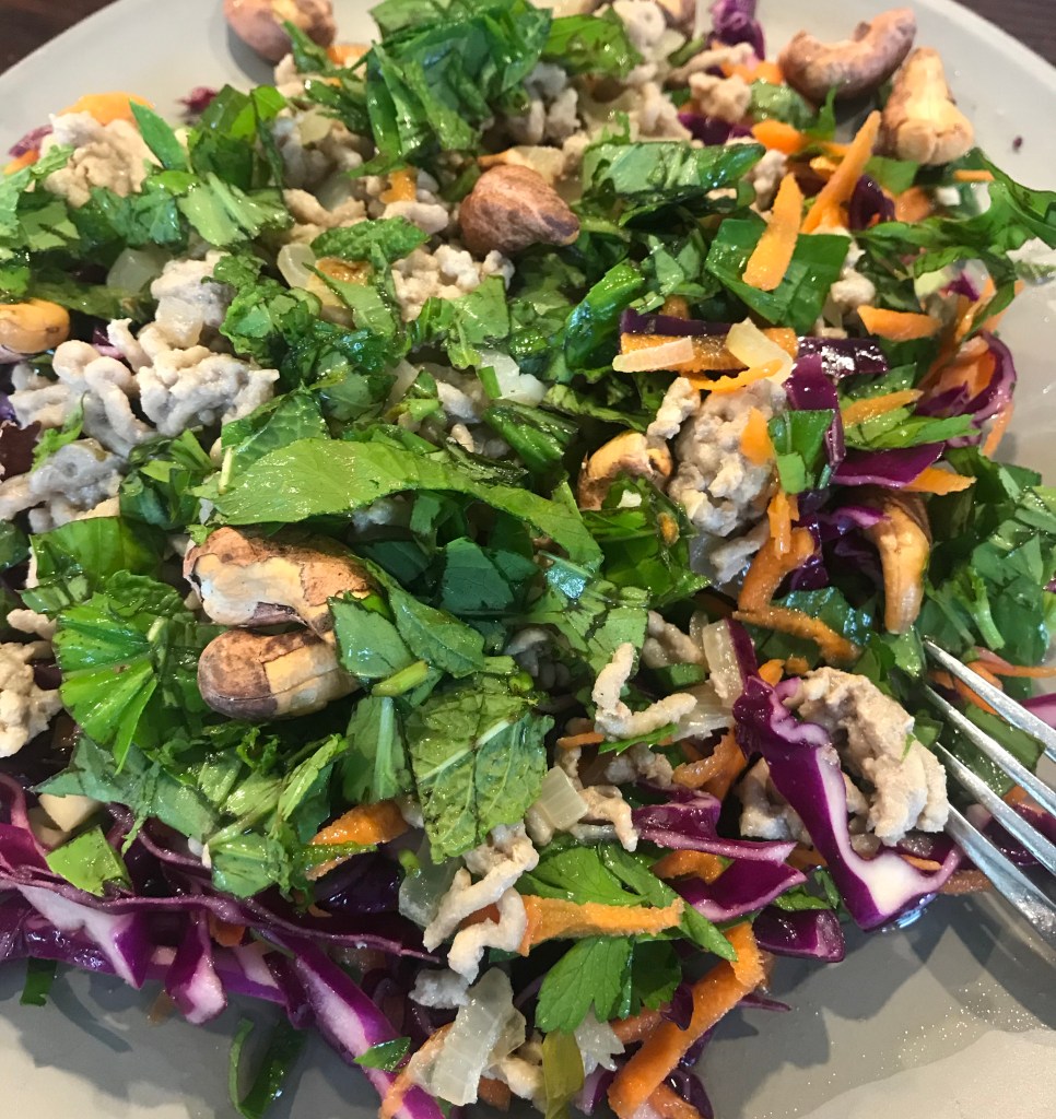 Saute onions and garlic until transparent. Add pork mince, kaffir lime leaves and ginger and gently cook, stirring and breaking up all the time. Once cooked through add the sauces/stock and cook for a few more mins. Serve on Slaw – bought or homemade – and top with toasted cashews, and lashings of lime juice. I used loads of mint, coriander and rocket in the slaw here. For the little people in your family (perhaps resistant to slaw), pop into a pita bread or serve over some brown rice.