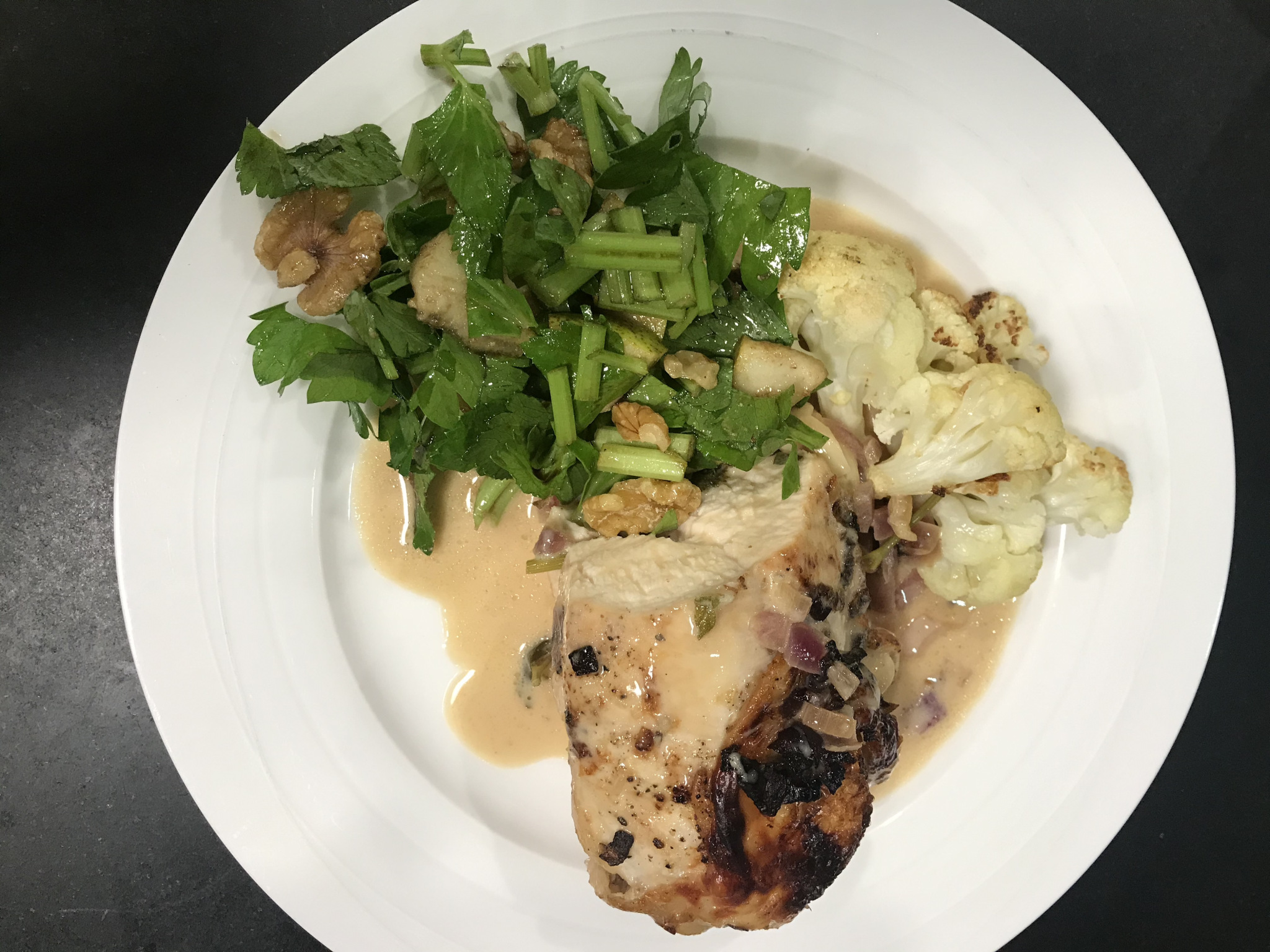 I served with chopped celery, walnut and pear salad with a lemon juice and olive oil dressing, and some roasted cauliflower. C’est délicieux.